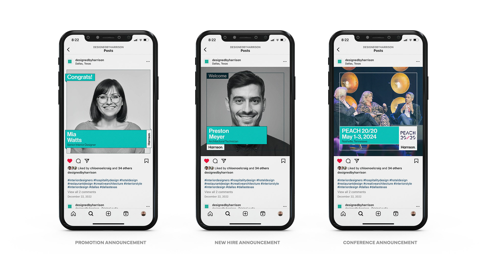 I created a suite of social media post templates for Harrison's marketing and social team to use when highlighting key promotions, new hires, or announcing what events Harrison will be attending. I wanted each of these three templates to have their own distinct style, but still fit well into the Harrison brand look and feel.
